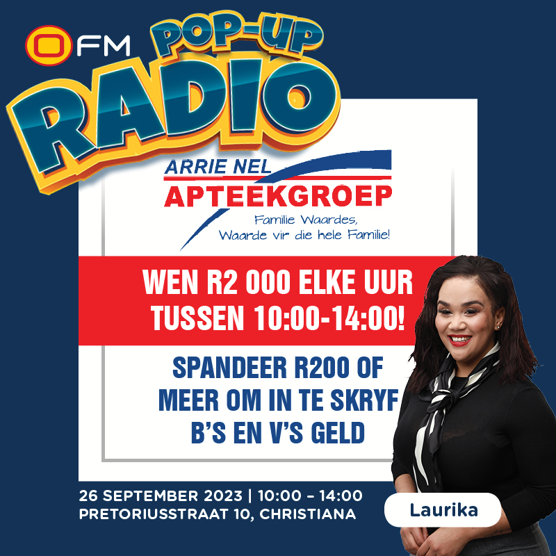 Venue: 10 Pretorius Street, ChristianaOn Tuesday, 26 September 2023, you stand a chance to win R2000 at Arrie Nel Christiana Pharmacy in Christiana! They will give away R2000 every hour, between 10:00 and 14:00, in store. All you need to do is spend R200 or more! Ts and Cs apply.