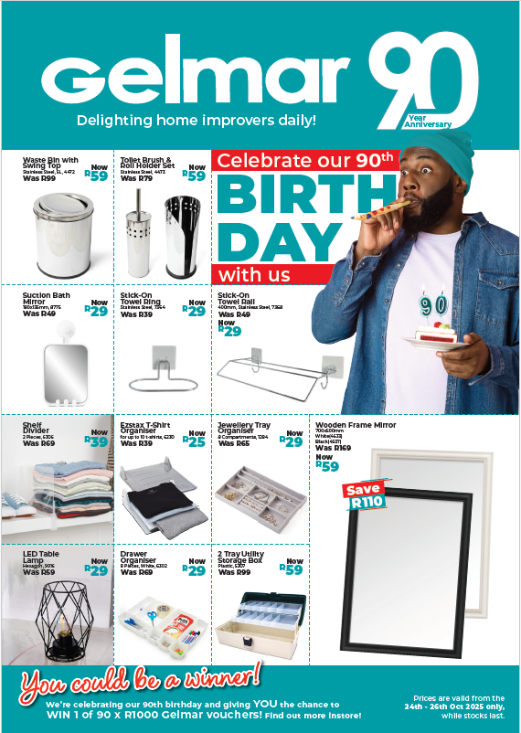 If you spend R1 000 or more in-store on the day, you get to pop a balloon and win a guaranteed prize. But that’s not all – you also stand a chance to win one of 90 Gelmar vouchers of R1 000 each! All you have to do is take a photo at the Gelmar photobooth in the store on 25 October, post it on Facebook or Instagram, tag Gelmar SA, use the hashtags #Gelmar90 and #Gelmar, and tell us what you bought! Ts & Cs apply.