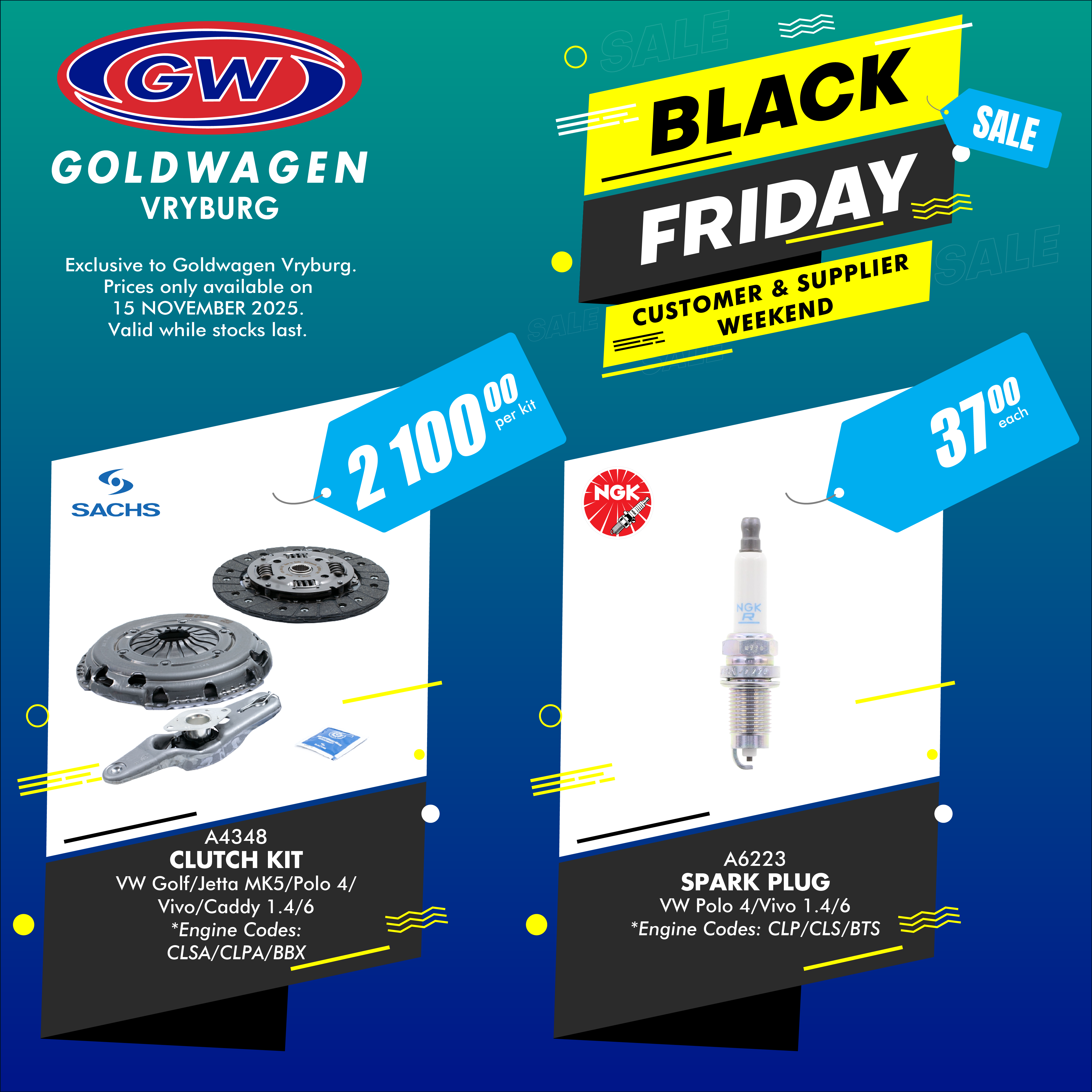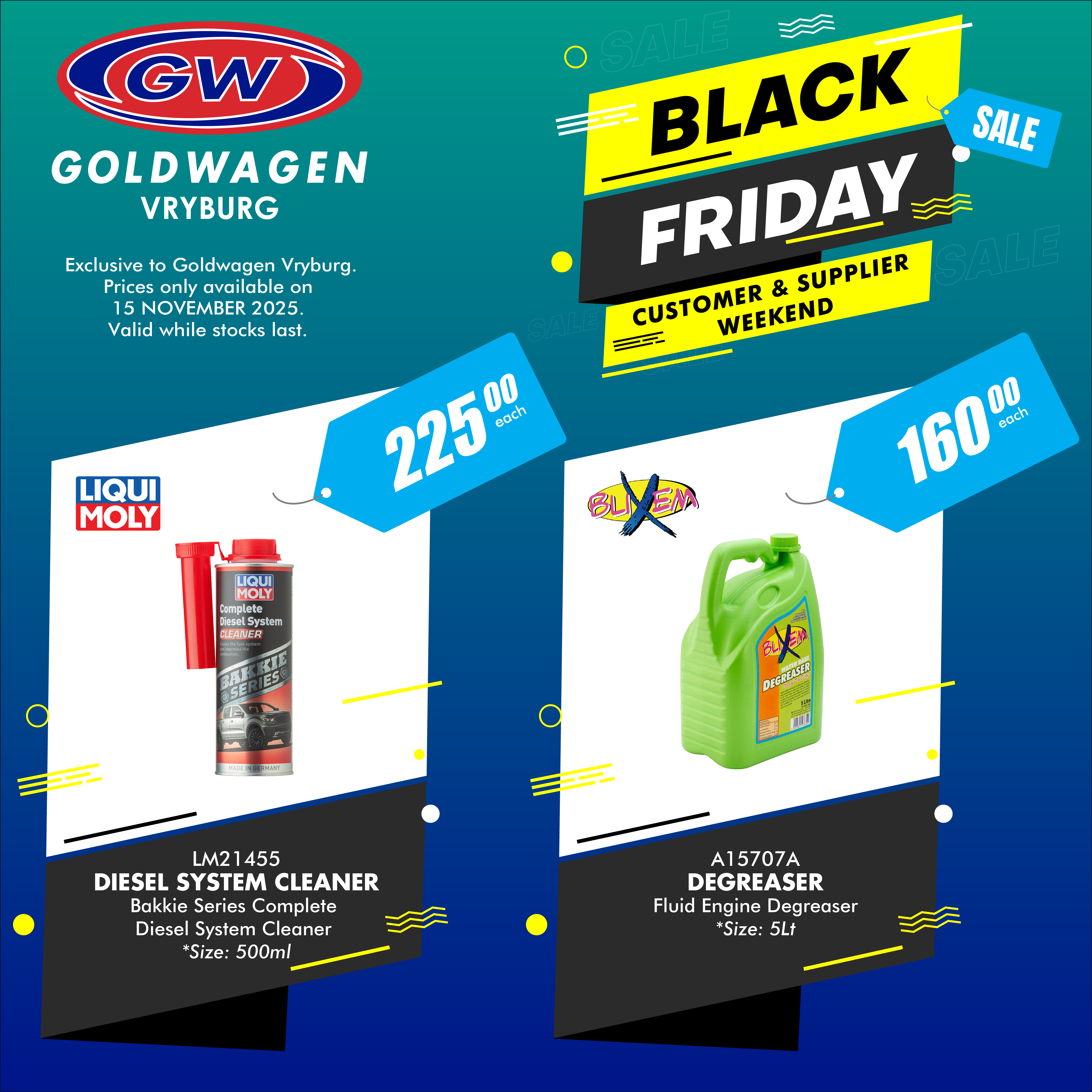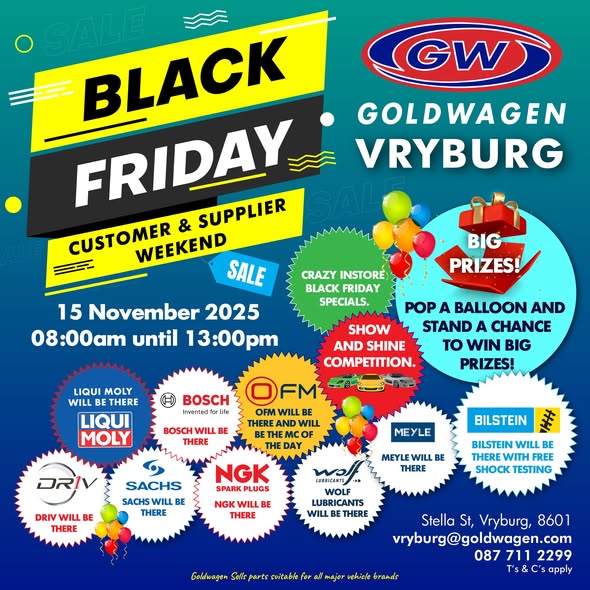 Join Pulane Nel-Sekepe on Saturday, 15 November 2025, for Goldwagen Vryburg’s Customer and Supplier Day at 192 Stella Street, from 08:00 to 13:00.