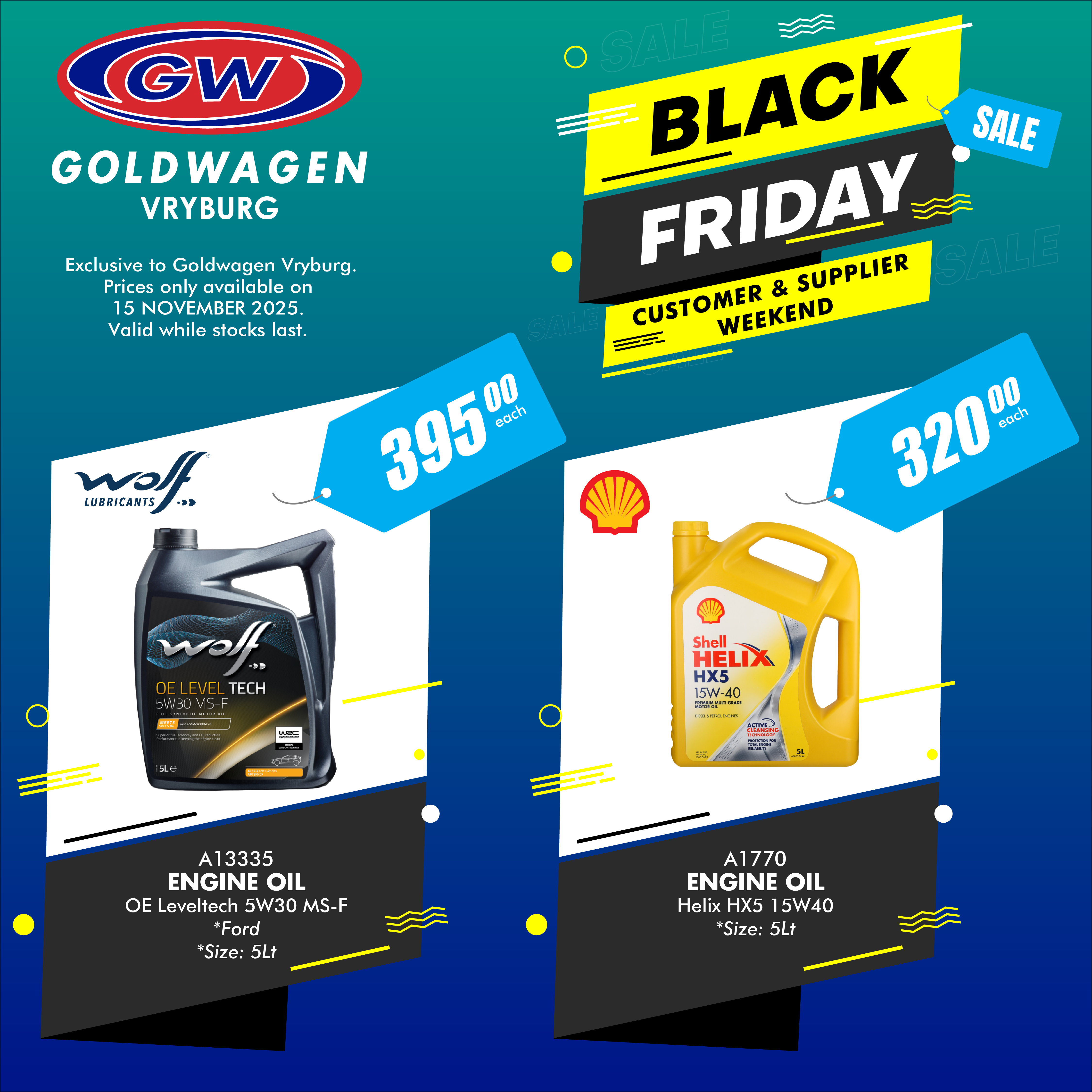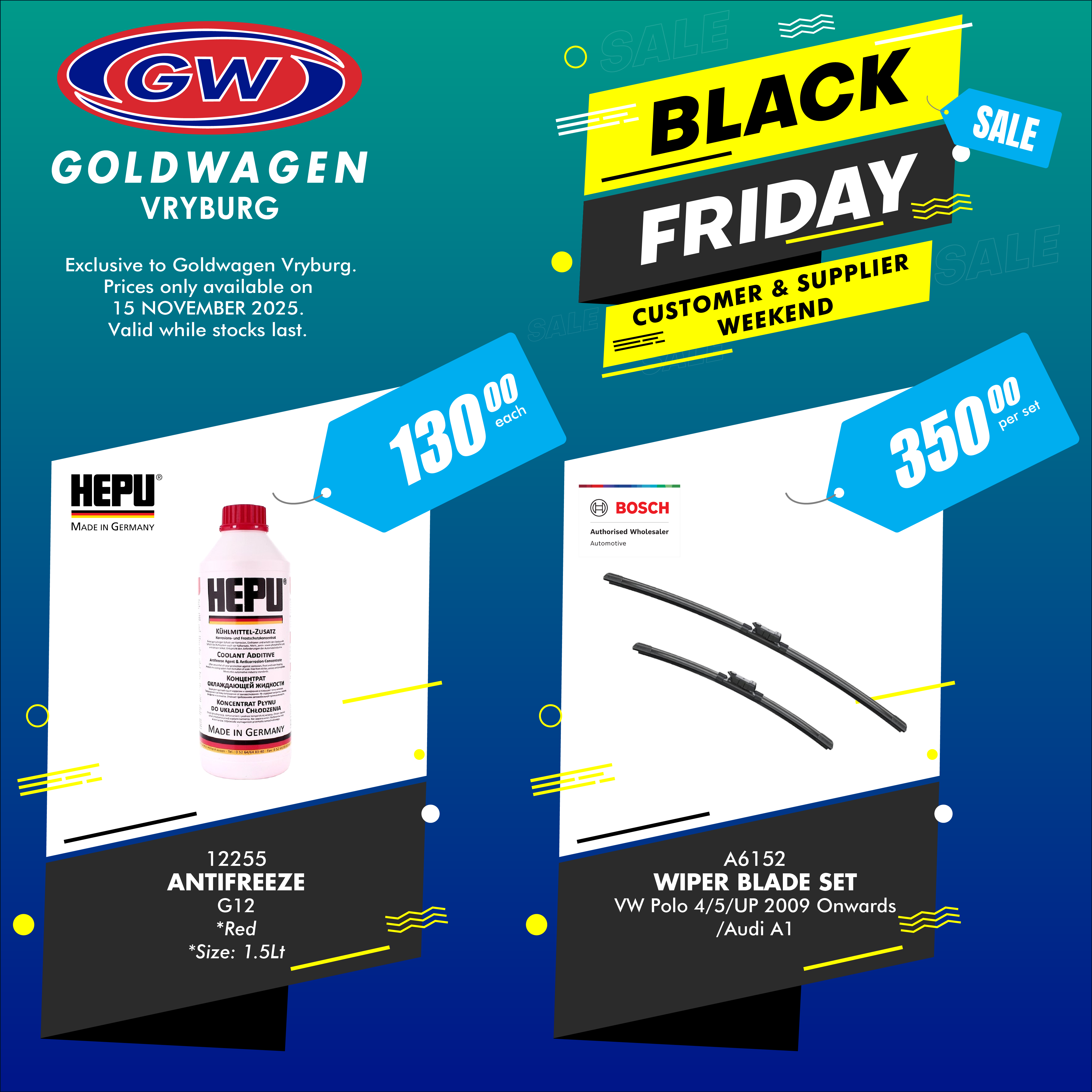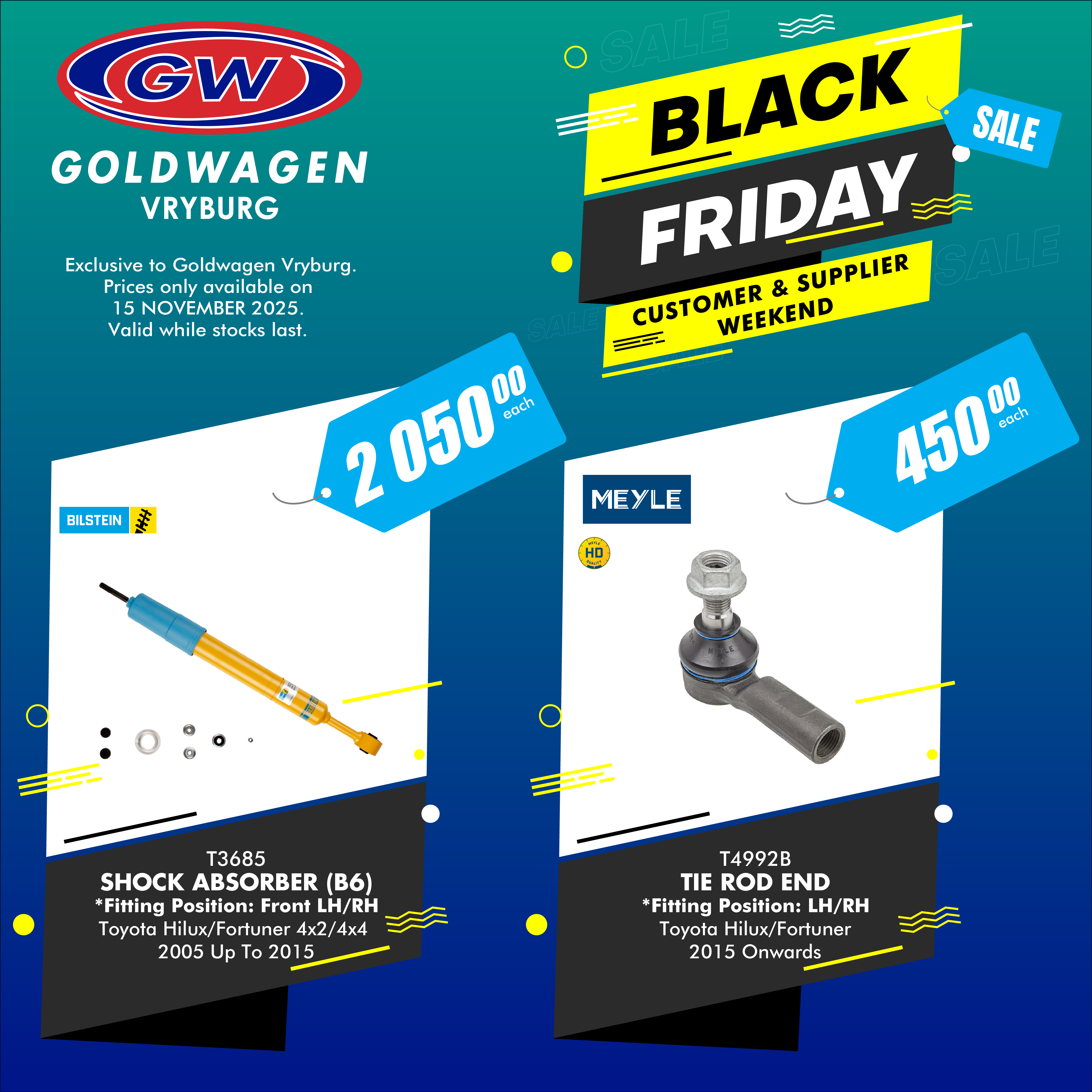 Expect crazy in-store Black Friday specials, ‘lekker’ food, free shock testing, and sexy cars on display for the Show & Shine competition.