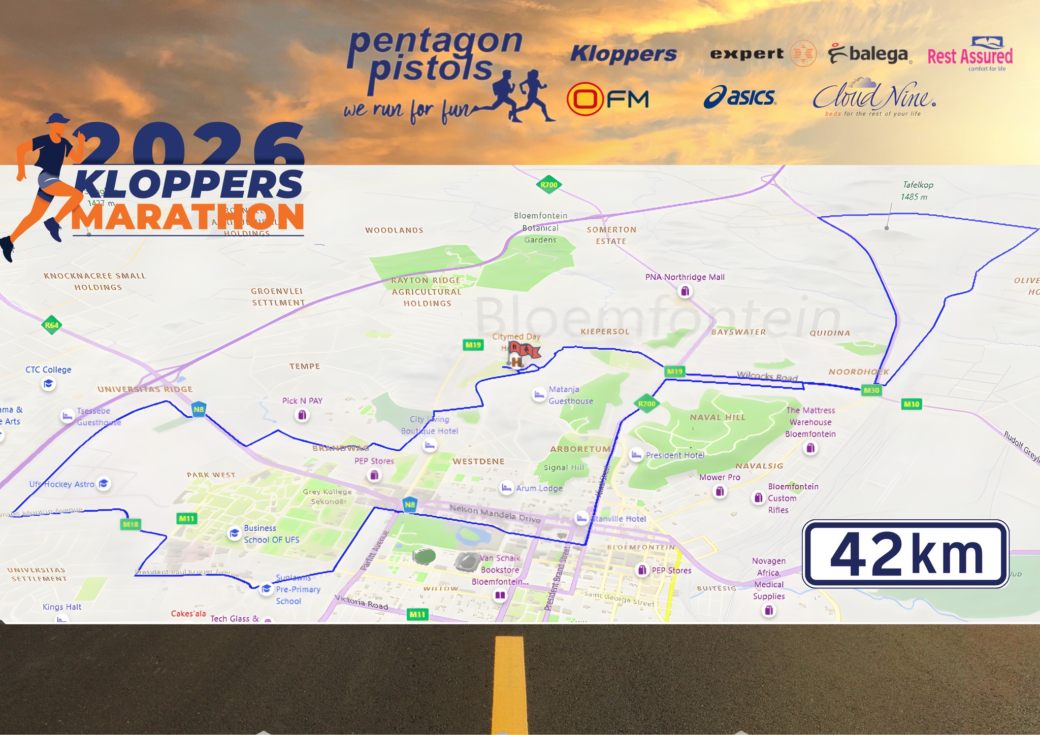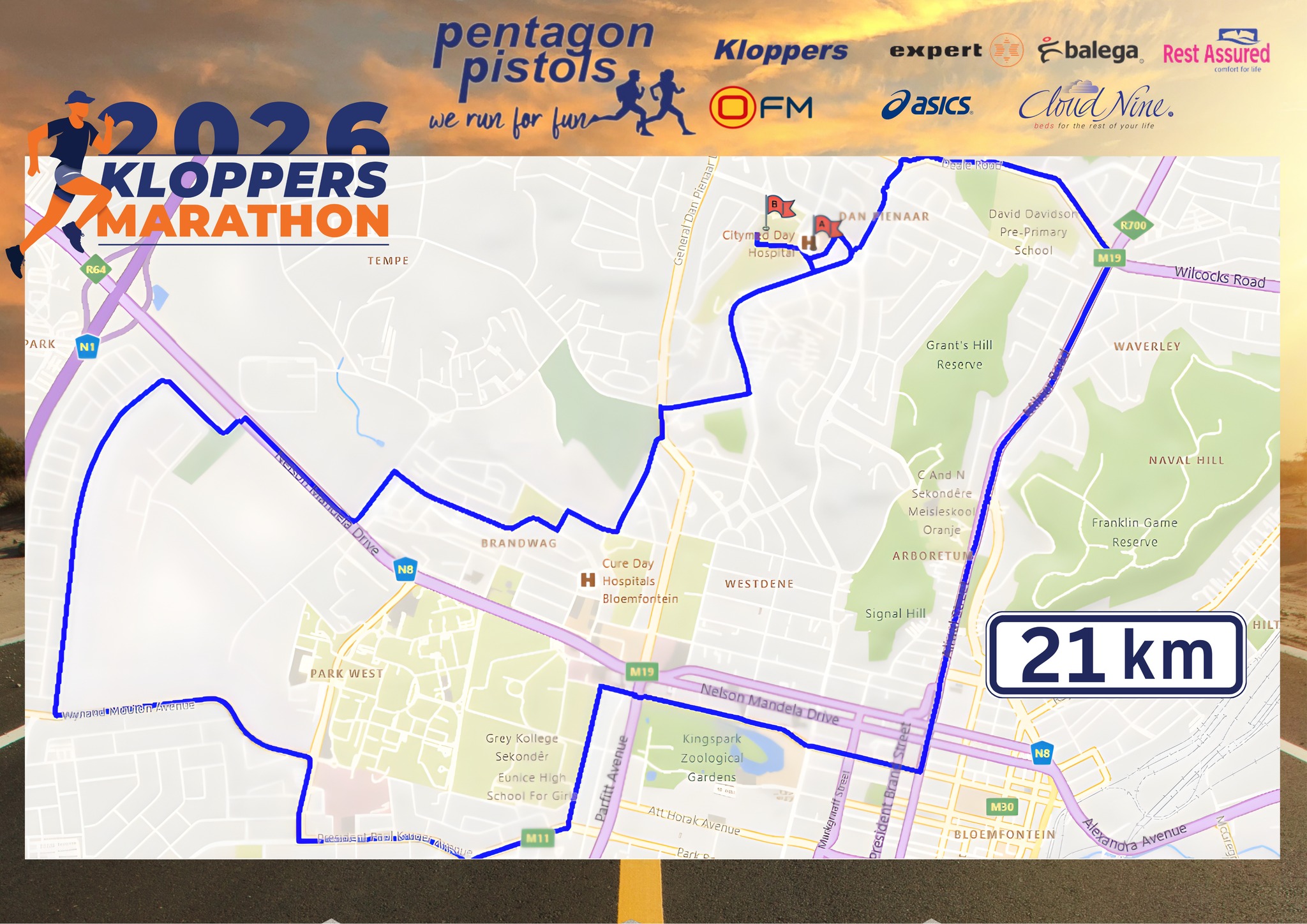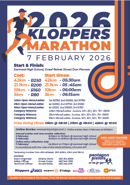 Enter now for Kloppers Marathon 2026! Venue: Sentraal High School, Graaf Reinet Street, Dan Pienaar, Bloemfontein