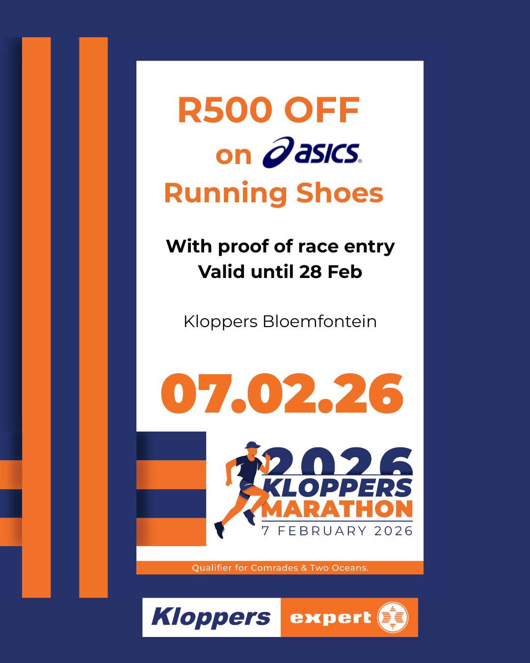 Visit Kloppers with your race entry and get R500 off Asics running shoes. Whether you’re training or racing, step into performance and comfort with Asics.