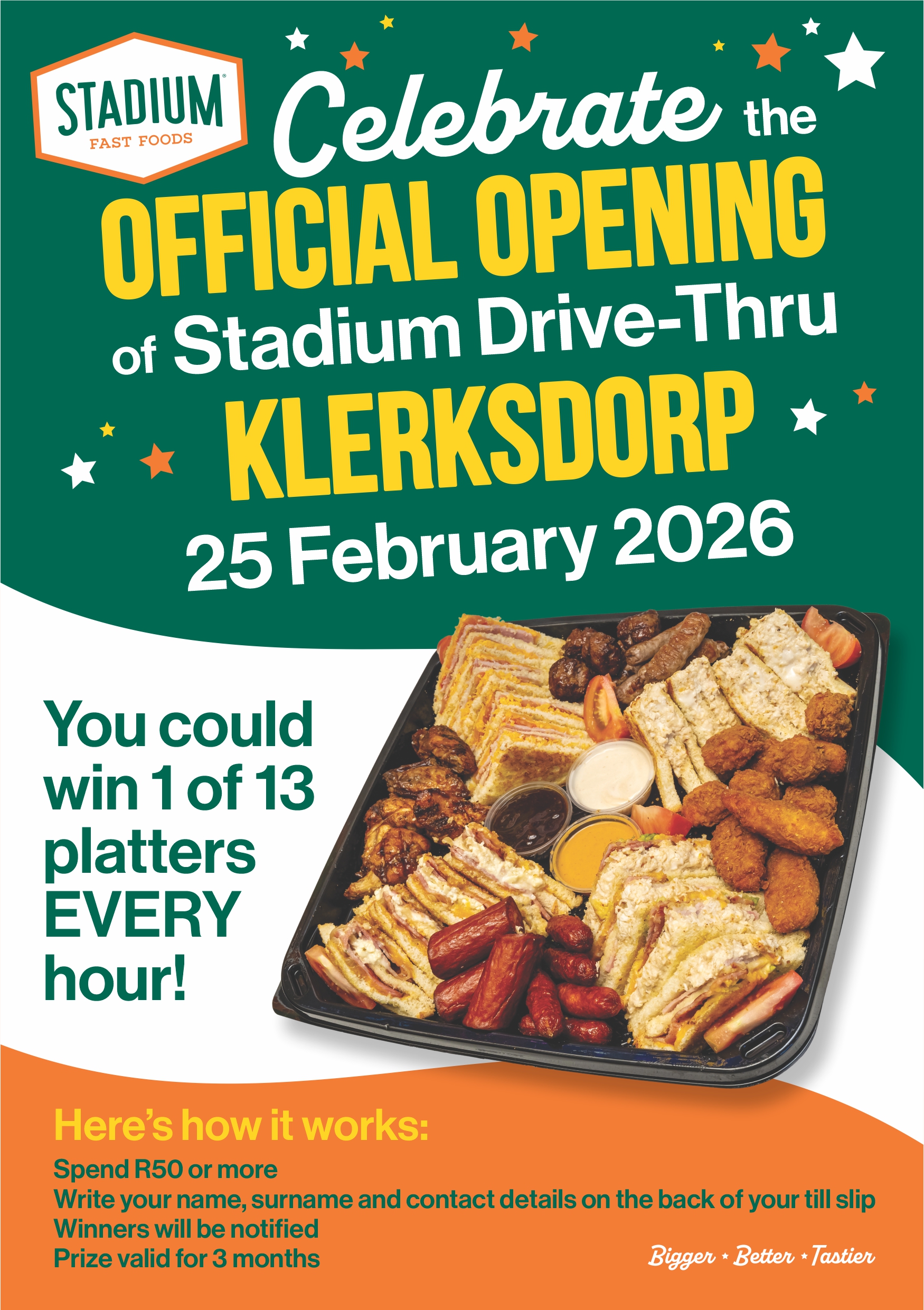 Venue: 3 Charl de Klerk Street, KlerksdorpStadium Fast Foods has been serving Klerksdorp, and now it’s time to celebrate the official opening of the Stadium Drive-Thru at 3 Charl de Klerk Street on 25 February 2026!