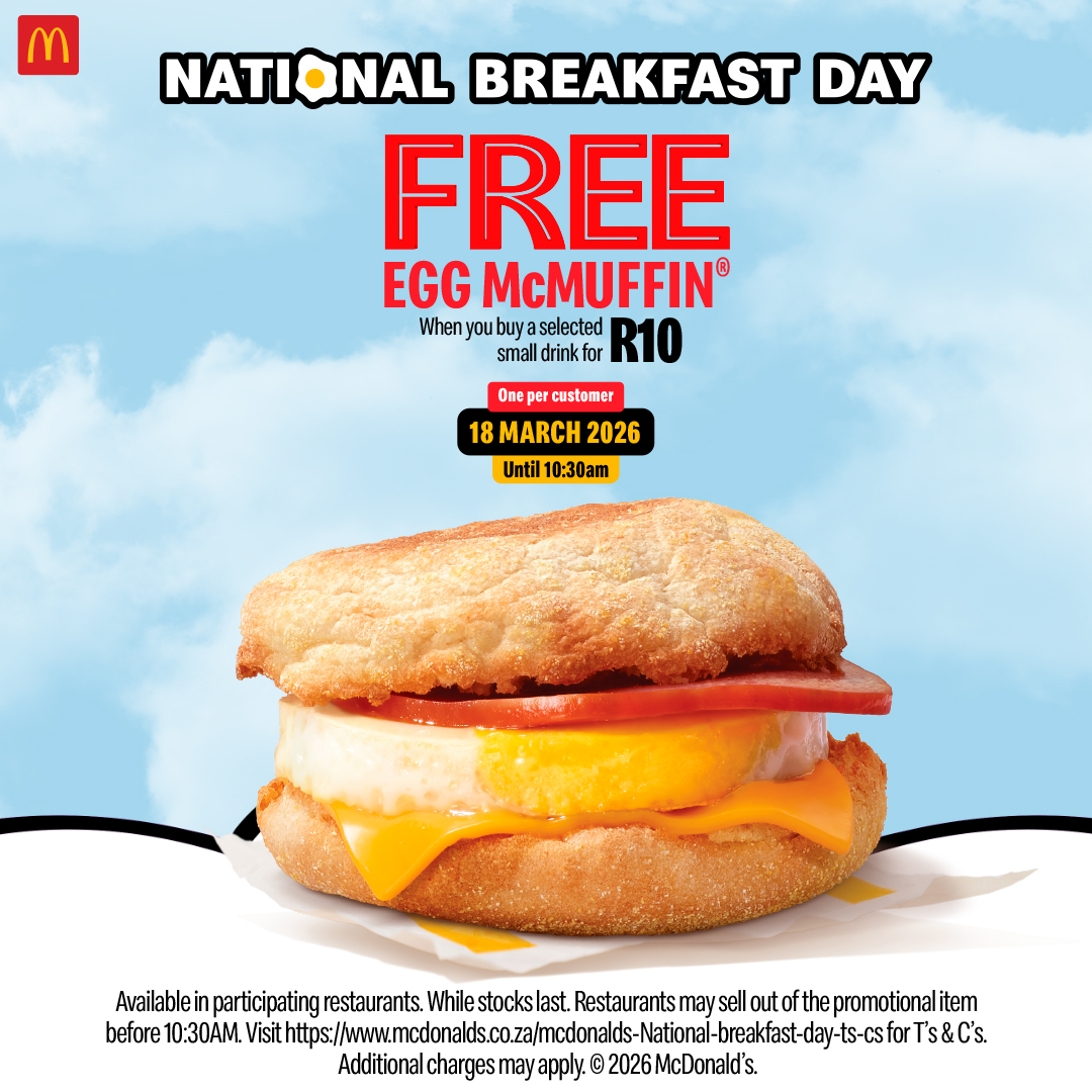 From 16 to 18 March, enjoy a FREE Egg McMuffin when you buy a R10 small drink.